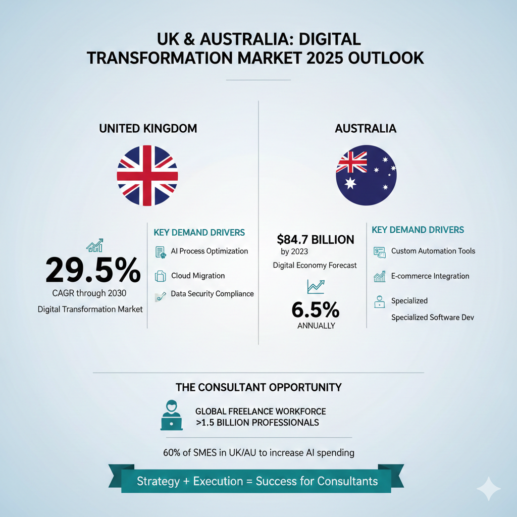 COIMBATORE, TAMILNADU, INDIA, November 26, 2025 /EINPresswire.com/ -- As the digital transformation market in the United Kingdom and Australia accelerates toward record highs in 2025, a widening "execution gap" threatens to stall growth for independent consultants and boutique agencies. While strategic thinking is in high demand, many solopreneurs and small startups lack the immediate technical firepower to deliver large-scale, complex projects.The 2025 Market Imperative: Data Underpinning the Transformation
