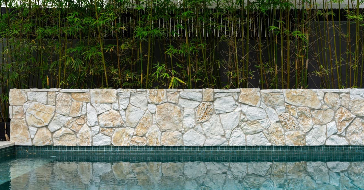 A natural stone feature wall introduces texture and contrast, while tropical planting softens the edges of the pool and improves privacy. The surrounding timber deck provides a dedicated area for sun lounging and relaxation, allowing the space to function as both a visual focal point and a practical outdoor retreat.